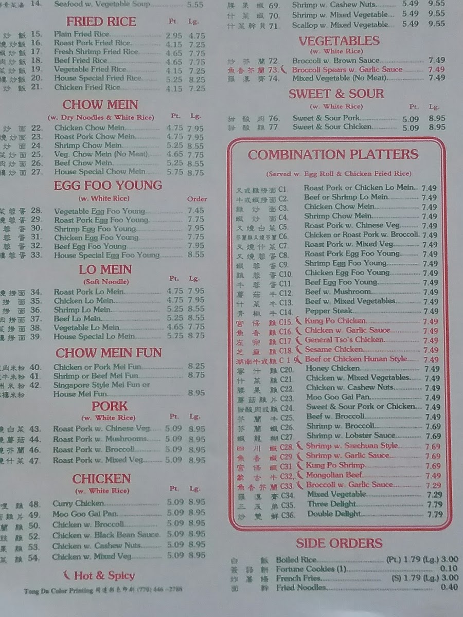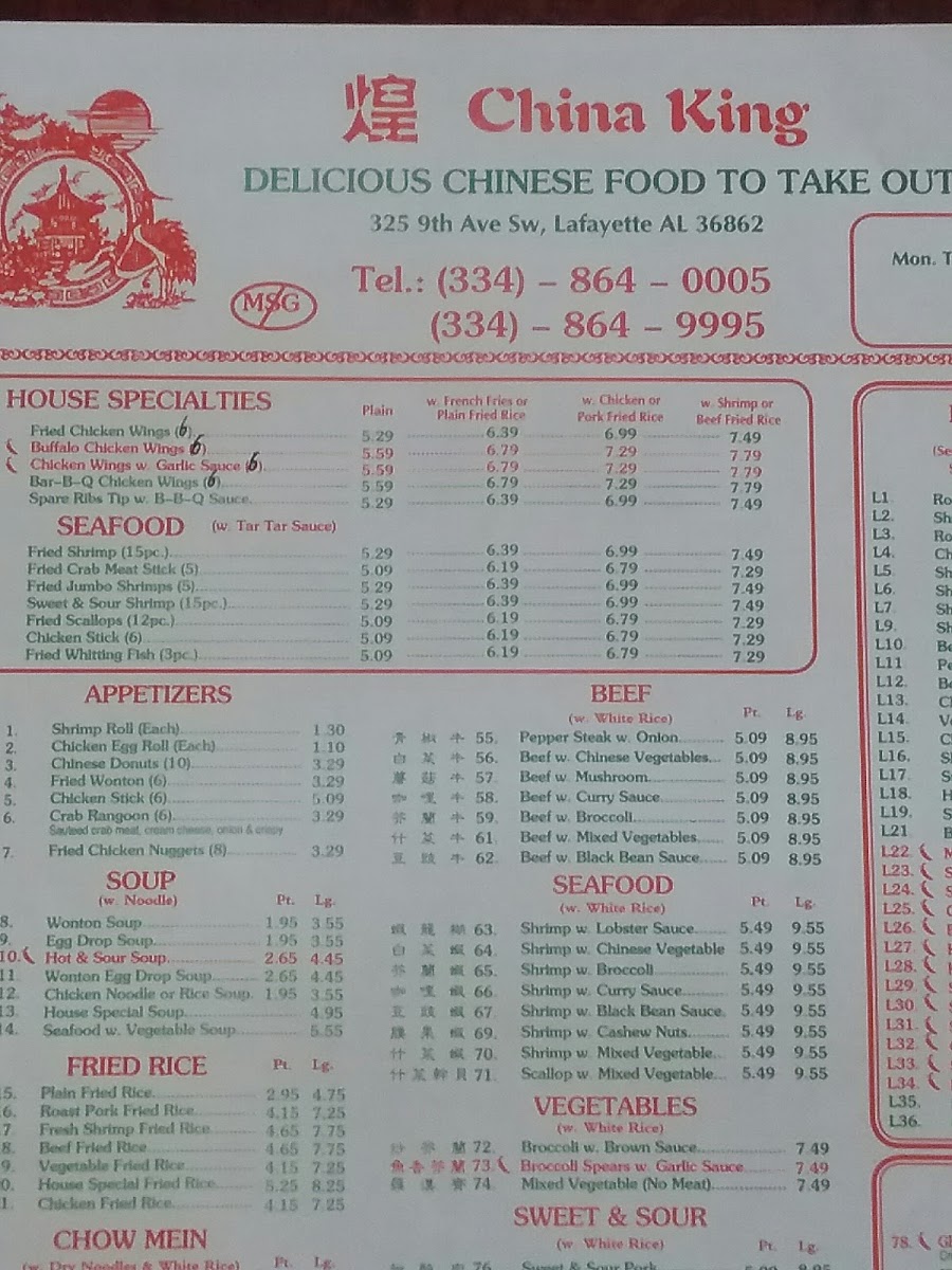 China King, nestled in La Fayette, AL, invites diners to savor authentic Chinese flavors with a menu that truly stands out. The house specialties spotlight an irresistible trio of chicken wings: classic Fried Chicken Wings, spicy Buffalo Chicken Wings, and aromatic Chicken Wings with Garlic Sauce, each bursting with bold, satisfying tastes. For noodle lovers, the Lo Mein selection offers a variety of options including Roast Pork, Chicken, Shrimp, Beef, and even a vegetarian House Special Lo Mein, all expertly prepared to balance rich, savory flavors and perfect textures.
